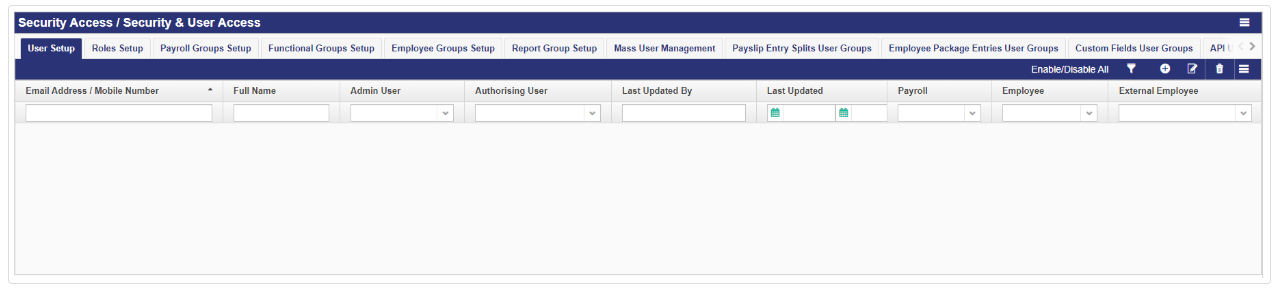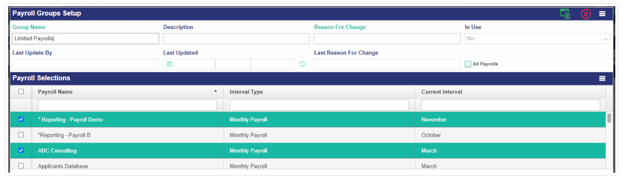 In order to limit the payrolls that a user has access to, create a new Payroll Group in the Payroll Groups Setup Tab.