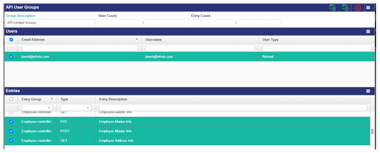 You can control the individual access points a user has access to by clicking on the 'API User Group' tab in the same section.